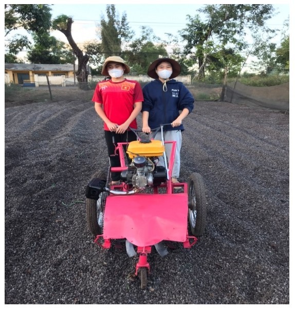 Thấy nông dân ở Kon Tum đảo cà phê với những dụng cụ thô sơ vừa mất công sức lại không đạt hiệu quả cao, Tuấn Anh và Thanh Hà (học sinh lớp 11) đã tìm tòi, chế tạo thành công máy đảo cà phê từ động cơ 50cm3.