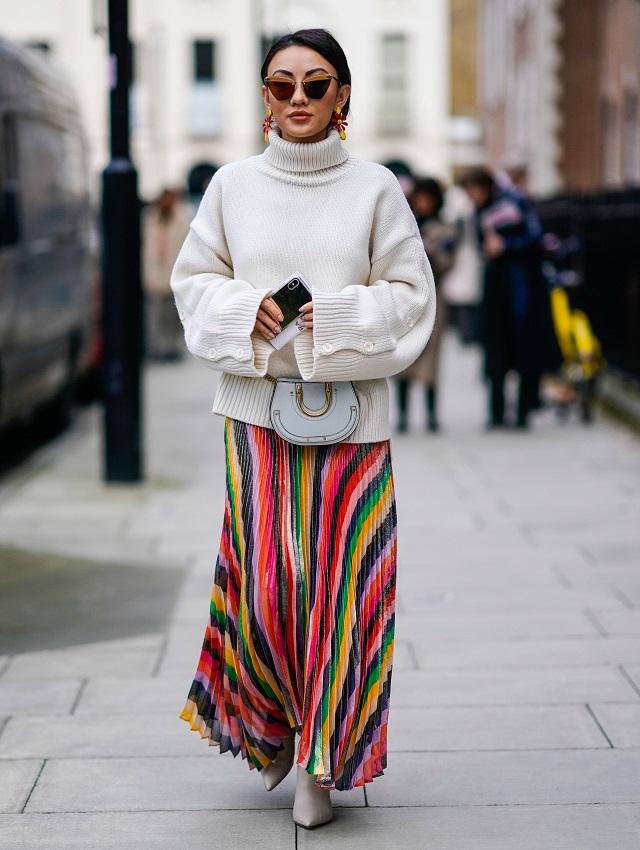 Chiếc áo cao cổ màu kem ấm cúng xứng đáng được mặc ít nhất một lần nữa trong năm. Nhưng thay vì kết hợp nó với quần bò, bạn hãy mặc một chiếc váy đầy màu sắc mà bạn thường dành cho thời tiết mùa hè. Bạn sẽ nhận được một kết quả ngoài mong đơi, không khác một fashionista.