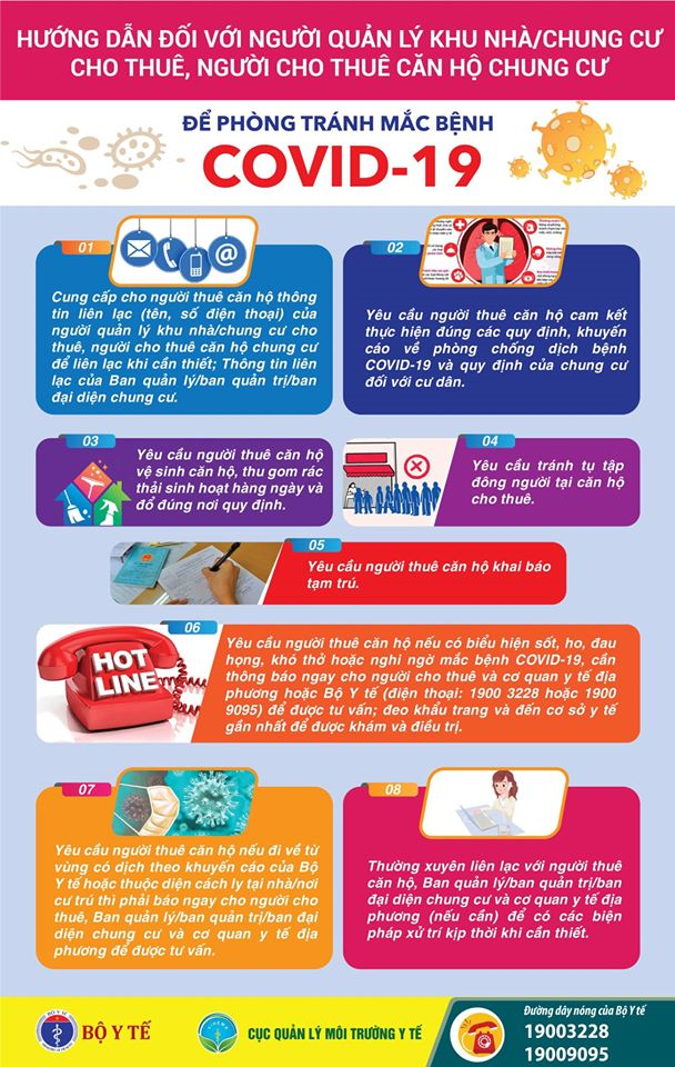 TH&SP Theo Bộ Y tế, người dân sống trong các căn hộ chung cư cần hạn chế tới nơi đông người, rửa tay thường xuyên và vệ sinh các bề mặt sạch sẽ để phòng ngừa Covid-19.