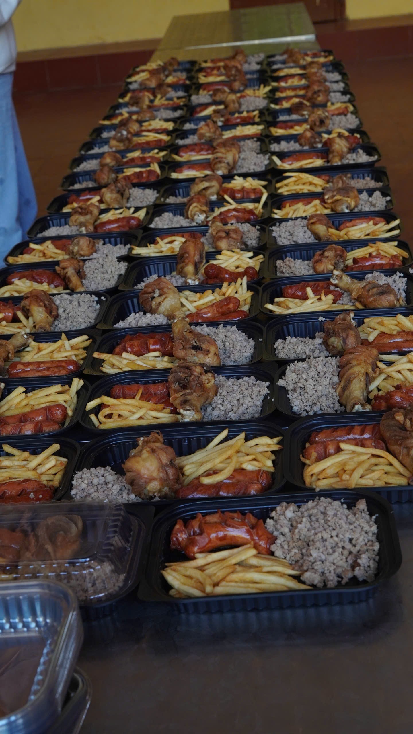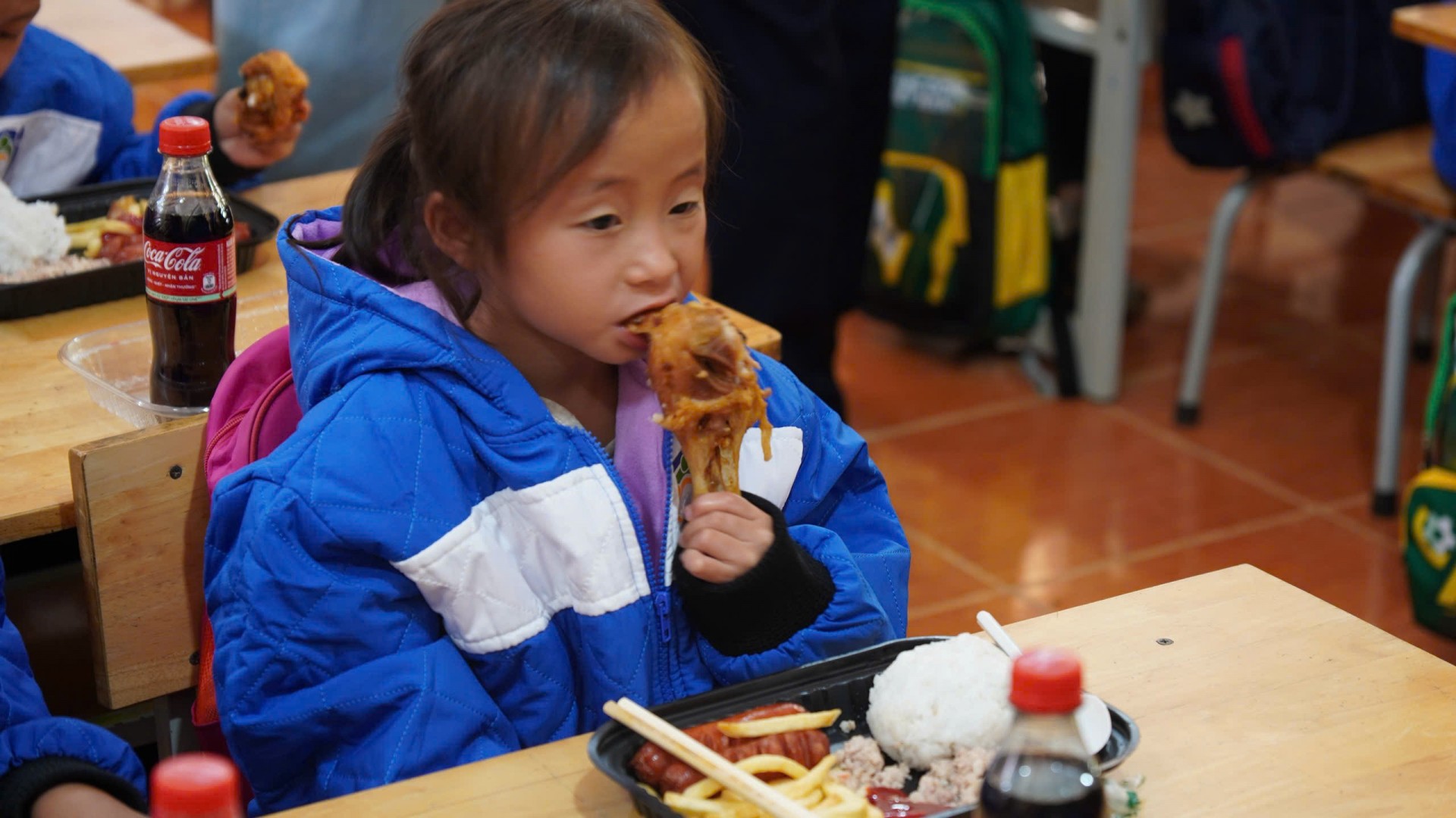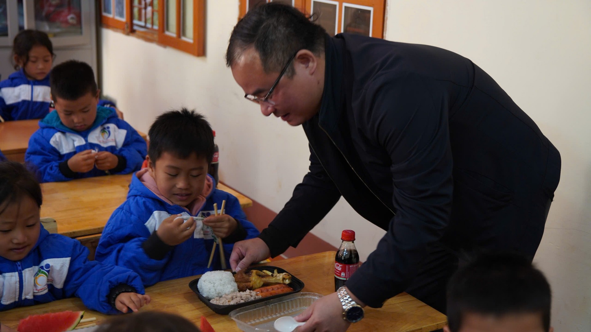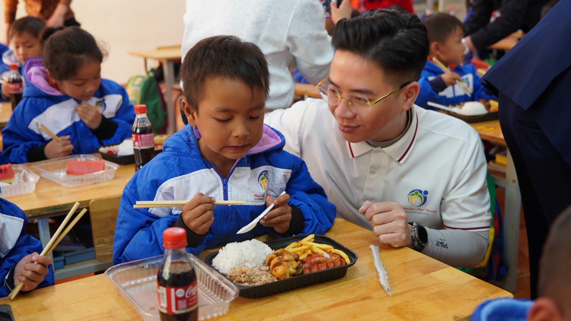 Song song với đó, 566 phần cơm nóng được chuẩn bị bởi đoàn thiện nguyện, giáo viên và đoàn thanh niên. Với các em nhỏ vùng cao, một bữa ăn đầy đủ chất và còn nghi ngút khói là điều không phải lúc nào cũng có được. Những khay cơm được chuẩn bị tỉ mỉ, những bàn tay ân cần phục vụ đã tạo nên một bữa trưa thật trọn vẹn – một trải nghiệm khiến nhiều em cứ nắm chặt muỗng cơm như sợ mất đi cảm giác ấm áp này.