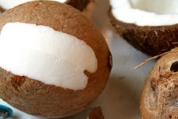 Bổ dừa ra làm đôi, dùng muỗng tách lớp cùi ra.