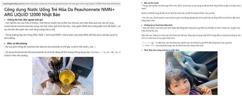 Mặc dù bị Cục An toàn thực phẩm tiếp tục lên tiếng cảnh báo, nhưng hiện nay một số website vẫn đăng tải những quảng cáo "thổi phồng" công dụng về sản phẩm TPBVSK Peauhonnête NMN + ARG Liquid 12000.