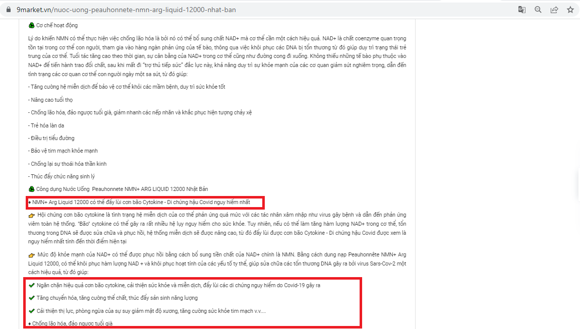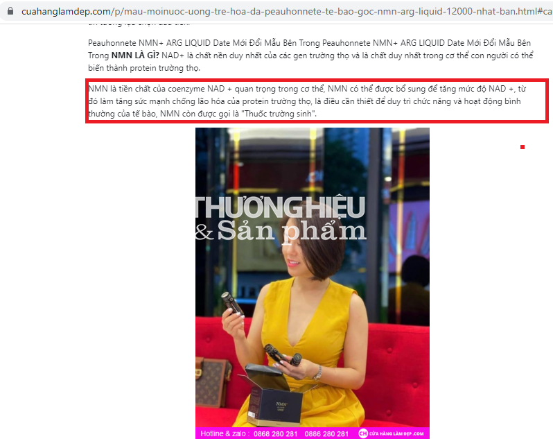 Thậm chí, website này còn vi von rằng sản phẩm Peauhonnête NMN + ARG Liquid12000 là "thuốc trường sinh": "NMN là tiền chất của coenzyme NAD + quan trọng trong cơ thể, NMN có thể được bổ sung để tăng mức độ NAD +, từ đó làm tăng sức mạnh chống lão hóa của protein trường thọ, là điều cần thiết để duy trì chức năng và hoạt động bình thường của tế bào, NMN còn được gọi là "Thuốc trường sinh".