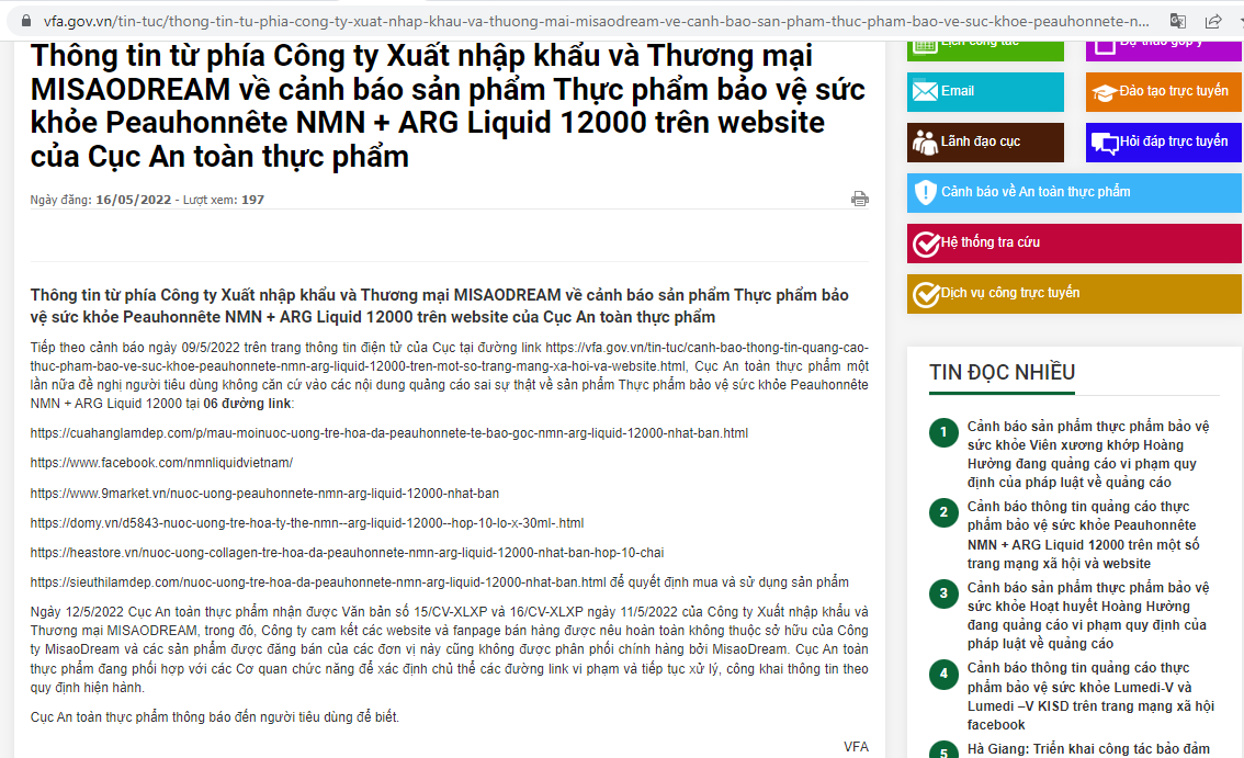 Cục An toàn thực phẩm (Bộ Y tế) cho biết, ngày 12/5, Cục đã chính thức nhận được phản hồi của Công ty Xuất nhập khẩu và Thương mại MisaoDream về việc nhiều website quảng cáo sai sự thật về sản phẩm thực phẩm bảo vệ sức khỏe (TPBVSK) Peauhonnête NMN + ARG Liquid 12000.