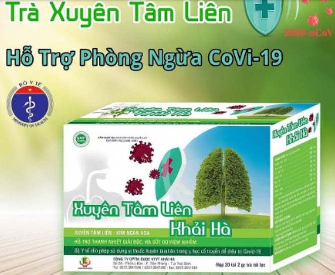 Cục An toàn thực phẩm cho biết, theo thông tin phản ánh, sản phẩm Trà xuyên tâm liên Khải Hà do Công ty CPTM Dược VTYT Khải Hà (địa chỉ số 2A, phố Lý Nam Đế, phường Tiên Phong, TP. Thái Bình) sản xuất và Công ty TNHH nghiên cứu dược liệu và ứng dụng Đông Y Việt phân phối độc quyền đang quảng cáo trên trang facebook.com/XuyenTamLienKhaiHa và https://xuyentamlien.site quảng cáo công dụng “Hỗ trợ điều trị viêm đường hô hấp cấp Covid 19”, “phòng ngừa Covid 19 hiệu quả được Bộ Y tế công nhận”.