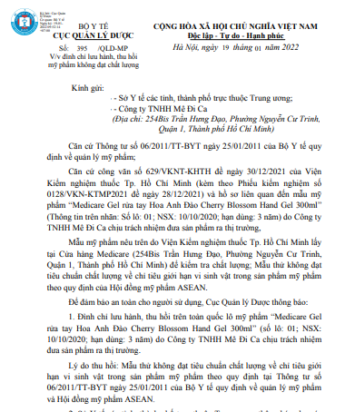 Theo đó, tại Quyết định số 395/QLD-MP ngày 19/01/2022 về việc đình chỉ lưu hành, thu hồi mỹ phẩm không đạt tiêu chuẩn chất lượng, Cục Quản lý Dược đã đình chỉ lưu hành, thu hồi trên toàn quốc lô mỹ phẩm “Medicare Gel rửa tay Hoa Anh Đào Cherry Blossom Hand Gel 300ml” (số lô: 01; NSX: 10/10/2020; hạn dùng: 3 năm) do Công ty TNHH Mê Đi Ca chịu trách nhiệm đưa sản phẩm ra thị trường.