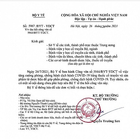 Trong Công văn 5944/BYT-YDCT, Bộ Y tế đề nghị các sở y tế tỉnh thành, bệnh viện y học cổ truyền, bệnh viện đa khoa, chuyên khoa, cơ sở kinh doanh dược liệu, thuốc cổ truyền cả nước căn cứ công văn này "tham khảo, lựa chọn mua sắm, đấu thầu, tiếp nhận từ các tổ chức, cá nhân ủng hộ cho cơ sở khám chữa bệnh để hỗ trợ điều trị cho người bệnh COVID-19, đội ngũ y bác sĩ tuyến đầu và F1 tại địa phương".