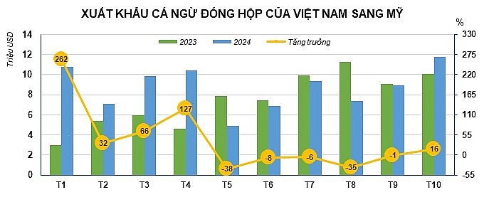 Theo số liệu của Hiệp hội Chế biến và Xuất khẩu Thủy sản Việt Nam (VASEP) giá trị xuất khẩu cá ngừ đóng hộp trong tháng này đạt gần 12 triệu USD, tăng 16% so với cùng kỳ năm 2023. Tính luỹ kế 10 tháng đầu năm 2024, giá trị xuất khẩu đạt hơn 87 triệu USD, tăng 17% so với cùng kỳ.