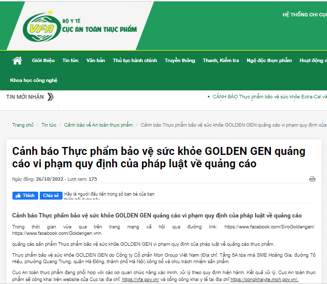 Trong quá trình các cơ quan chức năng xử lý, Cục An toàn thực phẩm đề nghị người tiêu dùng không căn cứ vào các nội dung quảng cáo sai sự thật về sản phẩm Thực phẩm bảo vệ sức khỏe GOLDEN GEN tại các trang mạng xã hội tại các đường link nêu trên để quyết định mua và sử dụng sản phẩm vì có nguy cơ gây ảnh hưởng đến sức khỏe và kinh tế.