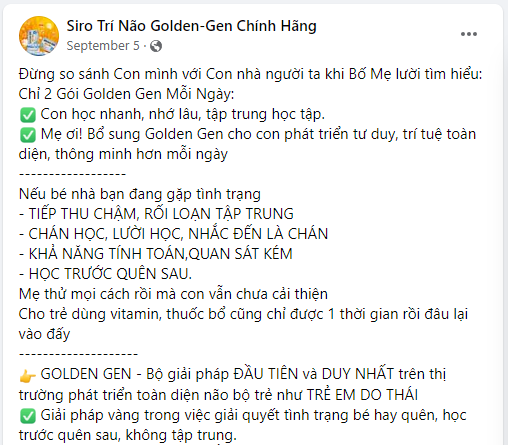 Cụ thể, trên Facebook "Siro Trí Não Golden-Gen Chính Hãng" - đường link https://www.facebook.com/SiroGoldengen, sản phẩm được giới thiệu là "GOLDEN GEN - Bộ giải pháp ĐẦU TIÊN và DUY NHẤT trên thị trường phát triển toàn diện não bộ trẻ như TRẺ EM DO THÁI", giúp mẹ không còn lo lắng về các vấn đề của bé như "tiếp thu chậm, rối loạn tập trung, lười học, quan sát kém".