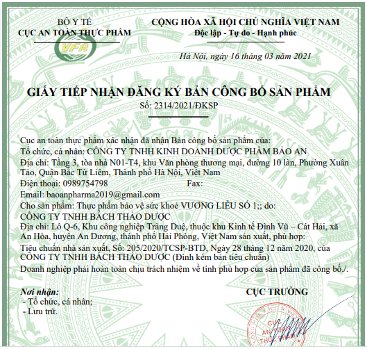 Được biết, sản phẩm TPBVSK Vương Liễu số 1 do Công ty TNHH Bách Thảo Dược (Địa chỉ: Lô Q-6, Khu công nghiệp Tràng Duệ, thuộc khu Kinh tế Đình Vũ – Cát Hải, xã An Hòa, huyện An Dương, thành phố Hải Phòng) sản xuất; và do Công ty TNHH Kinh doanh Dược phẩm Bảo An (Địa chỉ: Số Tầng 3. Tòa nhà N01-T4, khu Văn phòng thương mại, đường 10 làn, phường Xuân Tảo, quận Bắc Từ Liêm, thành phố Hà Nội, Việt Nam) công bố và chịu trách nhiệm.