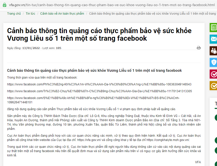Đáng nói, liên quan đến dòng sản phẩm TPBVSK Vương Liễu vào tháng 3/2020 Cục An toàn thực phẩm cũng đã đưa ra cảnh báo về việc 02 sản phẩm TPBVSK VƯƠNG LIỄU SỐ 1 và VƯƠNG LIỄU SỐ 2 được quảng cáo vi phạm quy định của pháp luật về quảng cáo.
