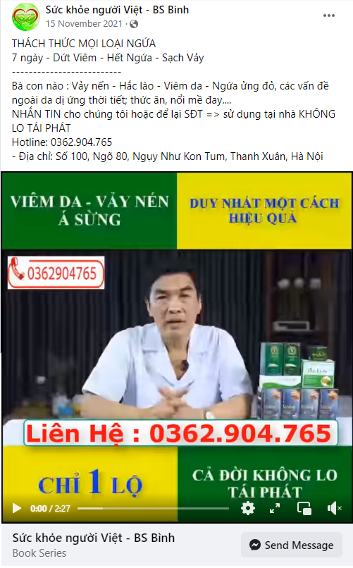 Hay như tại đường link https://www.facebook.com/S%E1%BB%A9c-kh%E1%BB%8Fe-ng%C6%B0%E1%BB%9Di-Vi%E1%BB%87t-BS-B%C3%ACnh-109626471448101 – Facebook Page “Sức khỏe người Việt - BS Bình” giới thiệu rằng TPBVSK Vương Liễu số 1 “THÁCH THỨC MỌI LOẠI NGỨA”, và có thể “Dứt Viêm - Hết Ngứa - Sạch Vảy” với các bệnh ngoài da như vảy nến, hắc lào, viêm da, ngứa ửng đỏ, các vấn đề ngoài da dị ứng thời tiết; thức ăn, nổi mề đay... chỉ trong 7 ngày.