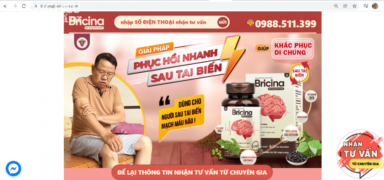 Website https://dialongbaohuyet.com quảng cáo Bricina "địa long bảo huyết" giúp khắc phục di chứng cho người sau tai biến mạch máu não.