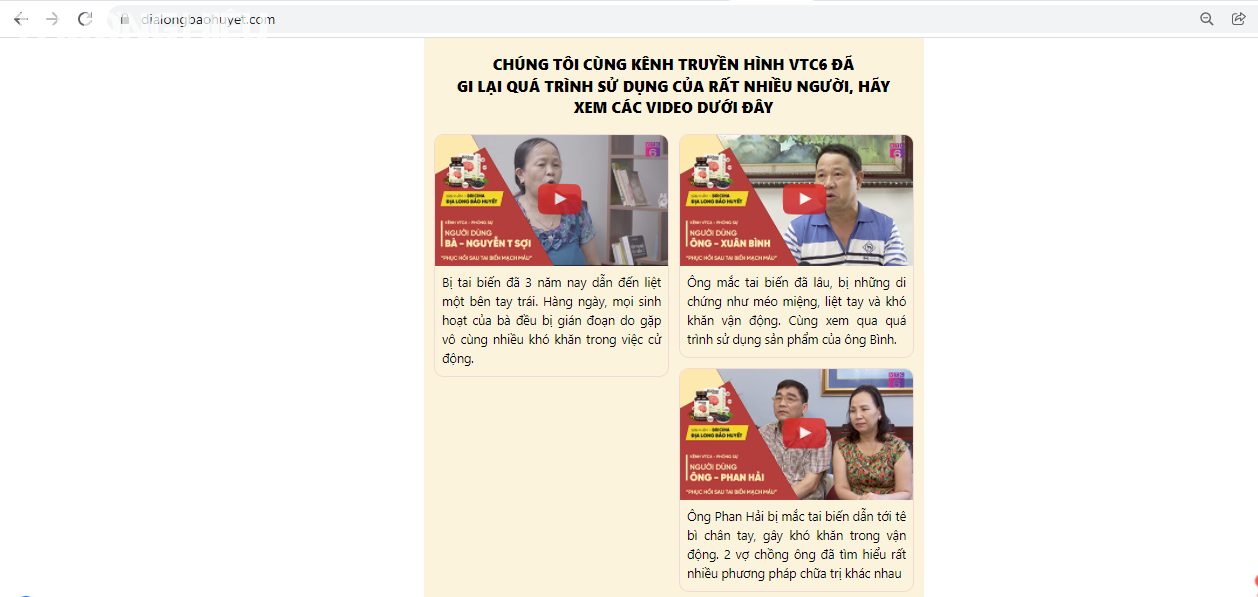 Ngoài ra, website https://dialongbaohuyet.com còn đăng tải rất nhiều video của khách hàng nói về sản phẩm TPBVSK Bricina "địa long bảo huyết" với công dụng "thần kì" nhằm quảng cáo cho sản phẩm.