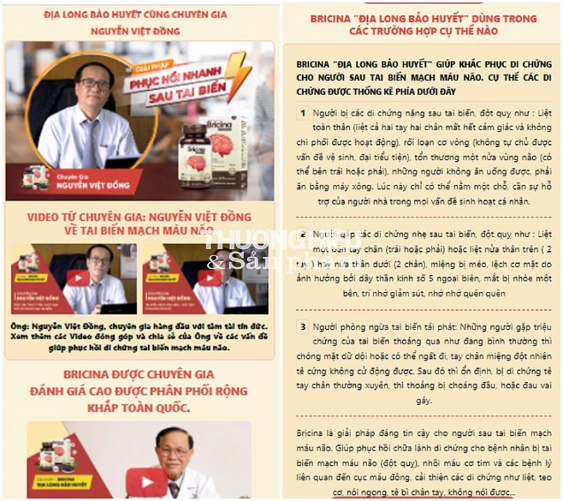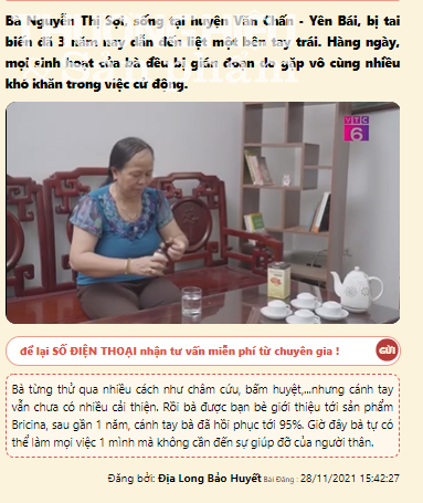 Theo đó, website https://dialongbaohuyet.com đăng tải video bà Nguyễn Thị Sợi, sống tại huyện Văn Chấn - Yên Bái nói về sản phẩm Bricina "địa long bảo huyết", bà Sợi cho biết: “Tôi bị tai biến, phải đi viện, con tôi tìm mua sản phẩm Bricina, trong đó có cuốn luyện tập phục hồi chức năng của Bộ Y tế. Tôi uống sản phẩm Bricina và kết hợp với luyện tập và giờ tôi tay chân tôi không còn run nữa và tôi làm được những việc nhẹ nhàng”.
