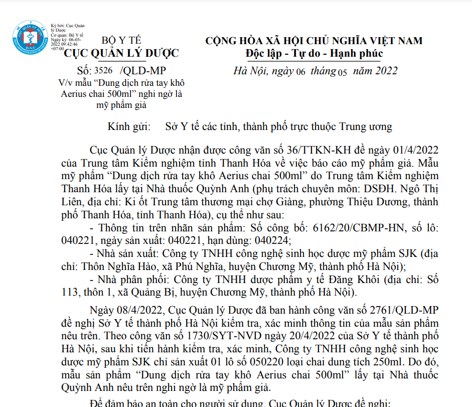 Theo công văn số 1730/SYT-NVD ngày 20/4/2022 của Sở Y tế thành phố Hà Nội, sau khi tiến hành kiểm tra, xác minh, Công ty TNHH công nghệ sinh học dược mỹ phẩm SJK chỉ sản xuất 01 lô số 050220 loại chai dung tích 250ml. Do đó, mẫu sản phẩm “Dung dịch rửa tay khô Aerius chai 500ml” lấy tại Nhà thuốc Quỳnh Anh nêu trên nghi ngờ là mỹ phẩm giả.