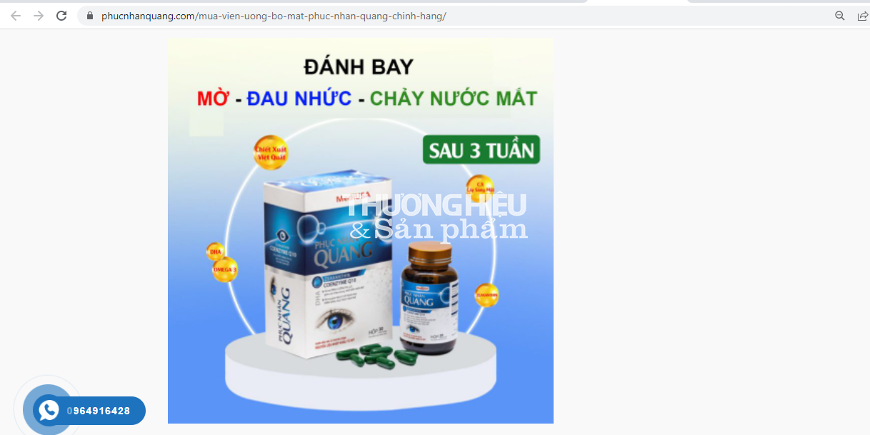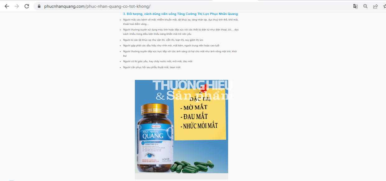 đang quảng cáo sản phẩm thực phẩm bảo vệ sức khỏe Phục nhãn quang với nội dung quảng cáo gây hiểu lầm như thuốc chữa bệnh, vi phạm quy định pháp luật về quảng cáo.