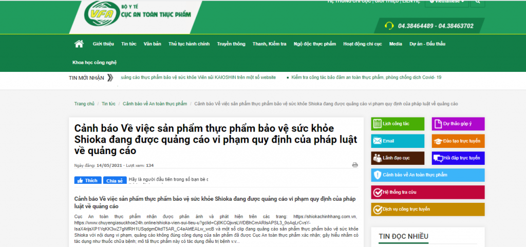 Cục An toàn thực phẩm (Bộ Y tế) vừa đưa ra cảnh báo về việc sản phẩm thực phẩm bảo vệ sức khỏe Shioka đang được quảng cáo không đúng công dụng của sản phẩm đã được Cục An toàn thực phẩm xác nhận; gây hiểu nhầm có tác dụng như thuốc chữa bệnh.