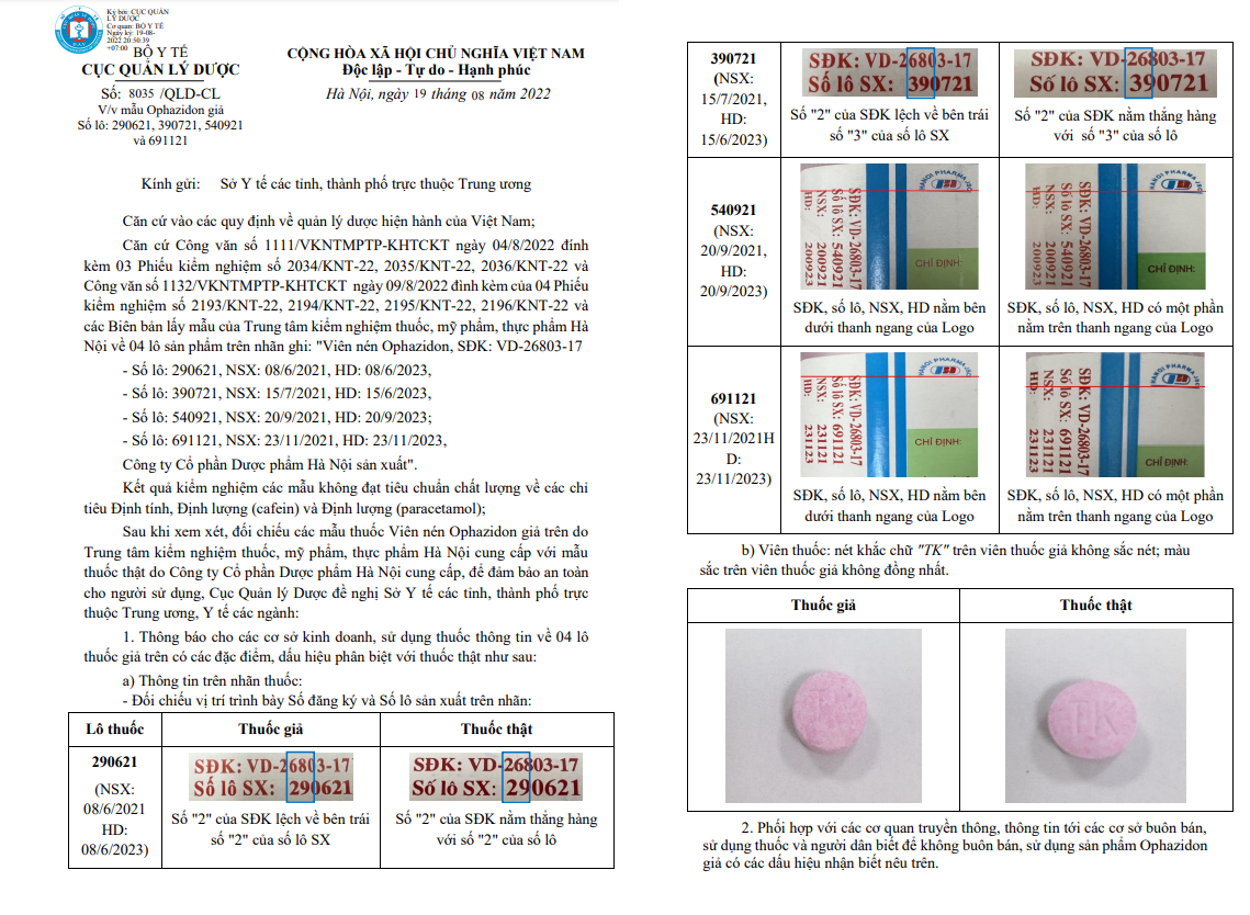 Cục Quản lý Dược cho biết, Cục nhận được công văn của Trung tâm kiểm nghiệm thuốc, mỹ phẩm, thực phẩm Hà Nội về 04 lô sản phẩm trên nhãn ghi: "Viên nén Ophazidon, SĐK: VD-26803-17. Số lô: 290621, NSX: 08/6/2021, HD: 08/6/2023, Số lô: 390721, NSX: 15/7/2021, HD: 15/6/2023, Số lô: 540921, NSX: 20/9/2021, HD: 20/9/2023; Số lô: 691121, NSX: 23/11/2021, HD: 23/11/2023. Số lô thuốc này ghi do Công ty Cổ phần Dược phẩm Hà Nội sản xuất.