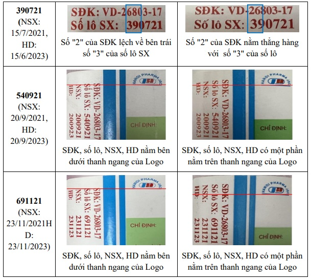 Sau khi xem xét, đối chiếu các mẫu thuốc Viên nén Ophazidon giả trên do Trung tâm kiểm nghiệm thuốc, mỹ phẩm, thực phẩm Hà Nội cung cấp với mẫu thuốc thật do Công ty Cổ phần Dược phẩm Hà Nội cung cấp, để đảm bảo an toàn cho người sử dụng, Cục Quản lý Dược đề nghị Sở Y tế các tỉnh, thành phố trực thuộc Trung ương, Y tế các ngành thông báo cho các cơ sở kinh doanh, sử dụng thuốc thông tin về 4 lô thuốc giả trên có các đặc điểm, dấu hiệu phân biệt với thuốc thật như sau: