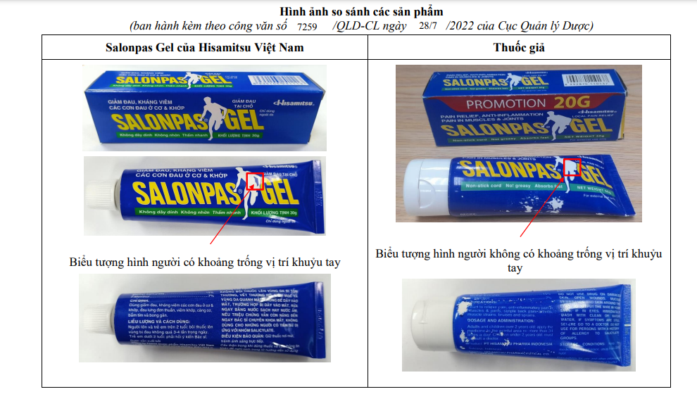 Vừa qua, sau khi nghi ngờ trên thị trường có các sản phẩm thuốc giảm đau giả Salonpas Gel, Công ty TNHH Dược phẩm Hisamitsu Việt Nam đã có văn thư số 609/22/HVC-QLD đề ngày 11/07/2022 gửi đến Cục Quản lý Dược để báo cáo về việc phát hiện các mẫu sản phẩm nghi ngờ là thuốc giả, trên nhãn ghi "SALONPAS GEL Net Weight 50g, Product: PT HISAMITSU PHARMA INDONESIA Sidoarjo, Indonesia, No. Reg: POM QL. 031 700 081", kèm các thông tin về nhãn, thông tin tra cứu trên Internet.