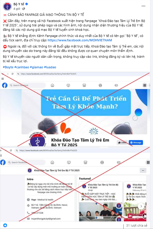 Thời gian gần đây, trên mạng xã hội Facebook xuất hiện trang Fanpage "Khoá Đào tạo Tâm Lý Trẻ Em Bộ Y tế 2025", sử dụng trái phép logo và các hình ảnh, nội dung nhận diện thương hiệu của Bộ Y tế; đăng tải các nội dung giả mạo Bộ Y tế tuyển sinh khoá học.