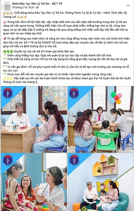 Theo tìm hiểu, tại Fanpage "Khoá Đào tạo Tâm Lý Trẻ Em Bộ Y tế 2025" có đăng tải những nội như sau: “Thông tin khóa học: 40 buổi học và tất cả các ngày trong tuần (phụ huynh chủ động sắp xếp thời gian hợp lý không ảnh hưởng tới việc học văn hóa của bé. Ví dụ bé rảnh 3 buổi trong tuần có thể báo với giáo viên). Thời gian học từ 30 phút đến 60 phút (tùy nội dung hôm đó học).