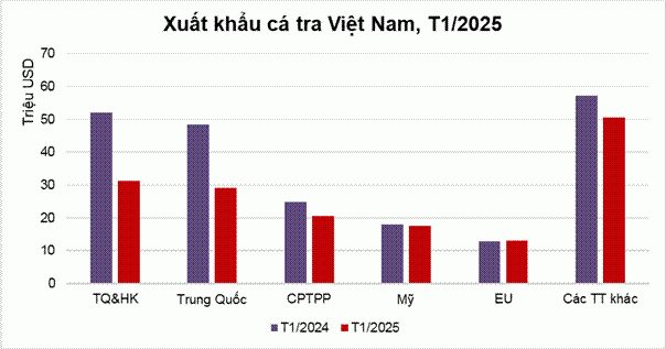 Tháng 1/2025, xuất khẩu cá tra GTGT mã HS16 chỉ chiếm tỷ trọng nhỏ, đạt hơn 3 triệu USD, tăng nhẹ 3% so với cùng kỳ năm ngoái.