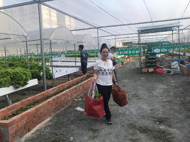 Khách hàng đến tận vườn rau thủy canh của anh Bình để tham quan, mua rau về sử dụng.