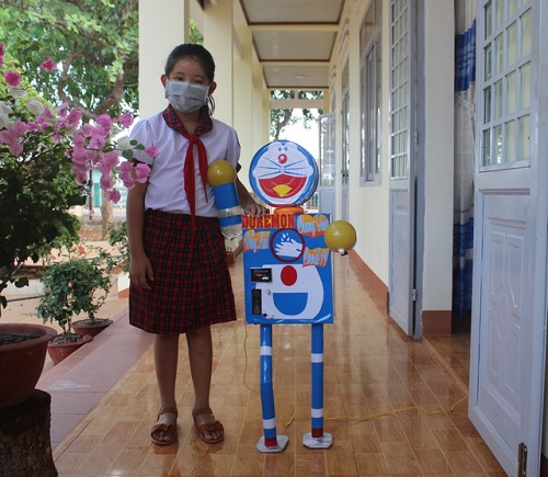 Phạm Thị Hoài An, tác giả của sản phẩm là học sinh lớp 4, Trường Tiểu học Nguyễn Thị Minh Khai (xã Đắk R’La, huyện Đắk Mil, tỉnh Đắk Nông). Chú mèo máy Doraemon sát khuẩn ra đời, khiến nhiều người bất ngờ về sự sáng tạo, gần gũi và tính năng phục vụ trong mùa dịch.
