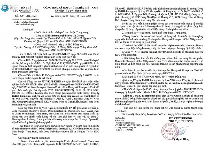 Ngày 6/5/2025, Cục Quản lý Dược (Bộ Y tế) ban hành Công văn số 1254/QLD-MP yêu cầu đình chỉ lưu hành, thu hồi và tiêu hủy sản phẩm Hanayuki Shampoo - Chai 300g, trên nhãn ghi: Số tiếp nhận PCB: 780/24/CBMP-ĐN; Số lô: 0010125; NSX: 050125; HD: 040127; Tổ chức chịu trách nhiệm đưa sản phẩm ra thị trường: Công ty TNHH thương mại dịch vụ VB Group (Địa chỉ: Tầng lửng cao ốc Đại Thanh Bình số 911-913-915-917 Nguyễn Trãi, Phường 14, Quận 5, TP. Hồ Chí Minh); Công ty TNHH EBC Group (Địa chỉ: Đường số 6, KCN Giang Điền, xã Giang Điền, huyện Trảng Bom, tỉnh Đồng Nai) sản xuất.