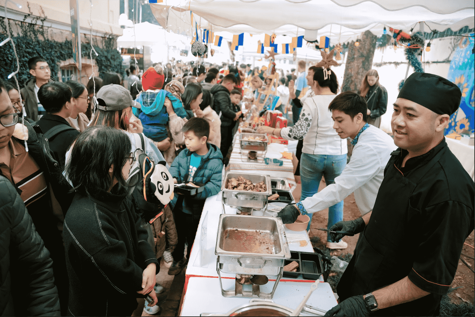 Khu vực ẩm thực là một trong những điểm nhấn nổi bật của hội chợ. Trong tiết trời se lạnh của Hà Nội, hương thơm của bánh nướng, xúc xích, thịt nướng,.. lan tỏa khắp không gian, thu hút đông đảo người tham quan dừng chân thưởng thức. Với nhiều gia đình, đây không chỉ là dịp trải nghiệm ẩm thực mà còn là khoảng thời gian quây quần, tận hưởng trọn vẹn không khí Giáng sinh. |
