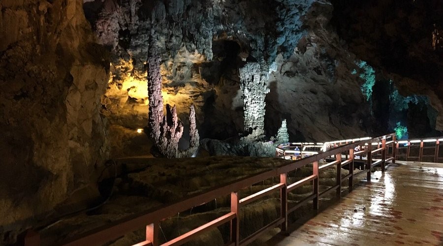 Bước qua cánh cổng đá khổng lồ, bạn như lạc vào cung điện ngầm của tạo hóa. Ánh sáng vàng cam dịu nhẹ hắt lên vòm đá, thạch nhũ lấp lánh như hàng ngàn ngọn đèn cổ xưa.