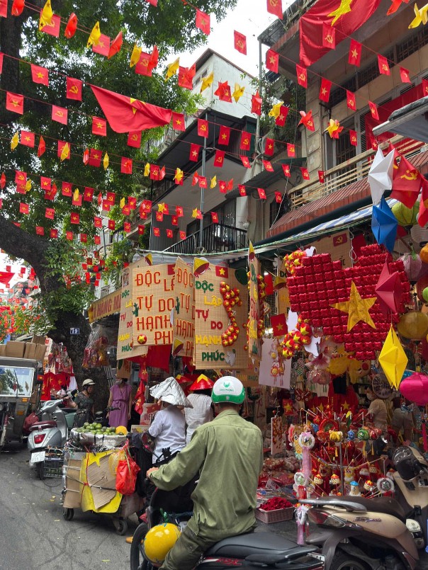 Toàn thành phố đang khoác lên mình tấm áo mới. Từ những con phố lớn đến các điểm du lịch của Hà Nội, khắp nơi đều tràn ngập sắc đỏ của cờ Tổ quốc. Cờ kết nối các con phố, dãy nhà. Tất cả hòa quyện tạo nên một khung cảnh rực rỡ, thiêng liêng, khơi dậy lên trong mỗi người dân Việt Nam tinh thần yêu nước, niềm tự hào dân tộc.