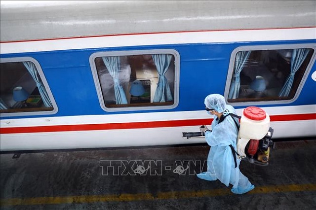 Phun thuốc khử trùng tại ga Hà Nội. Ảnh: Huy Hùng/TTXVN