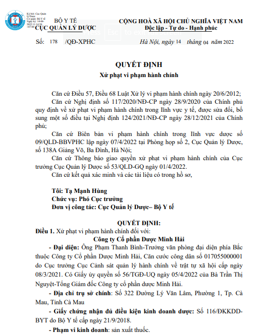 Theo đó, Công ty Cổ phần Dược Minh Hải bị xử phạt vi phạm hành chính với mức phạt là 70.000.000 đồng (bảy mươi triệu đồng).