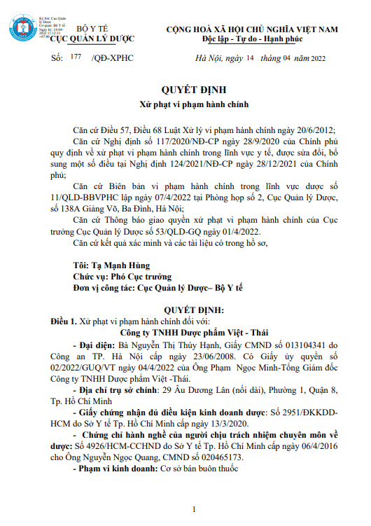 Theo đó, Cục Quản lý Dược thông báo xử phạt vi phạm hành chính đối với Công ty TNHH Dược phẩm Việt – Thái có địa chỉ trụ sở tại 29 Âu Dương Lân (nối dài), Phường 1, Quận 8, TP. Hồ Chí Minh, do bà Nguyễn Thị Thúy Hạnh làm đại diện và Ông Phạm Ngọc Minh làm Tổng Giám đốc.