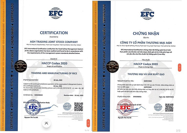 Chất lượng của gạo ST25 thương hiệu AGH đã được Tổ chức chứng nhận quốc tế EFC kiểm định và cấp giấy chứng nhận hệ thống quản lý theo tiêu chuẩn phù hợp tiêu chuẩn HACCP Codex 2020.