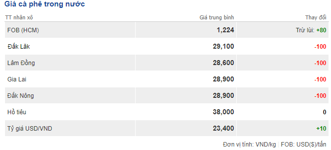 Ghi nhận đầu giờ sáng nay (25/4), giá cà phê hôm nay cao nhất tại tỉnh Đắk Lắk là 29.400 đồng/kg, giá thấp nhất tại tỉnh Lâm Đồng là 28.600 đồng/kg.