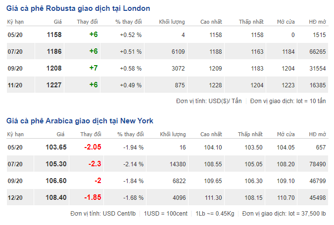 Trong khi tại New York, giá cà phê arabica tháng 5/2020 giảm nhẹ, cụ thể, giá cà phê arabica tăng 1,1 cent/lb (mức tăng 1,05%), giao dịch ở mức 105,7 cent/lb.