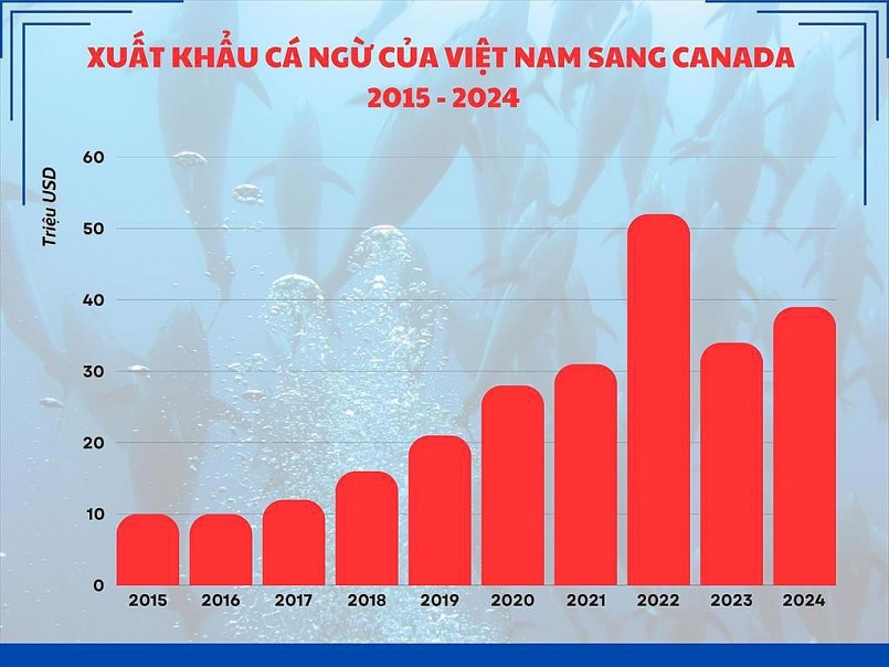 Theo số liệu thống kê của Hải quan Việt Nam, xuất khẩu cá ngừ của Việt Nam sang Canada sau khi đạt mức cao nhất vào năm 2022 (đạt gần 52 triệu USD) đã giảm xuống còn 39 triệu USD vào năm 2024, giảm 25%. Mặc dù kim ngạch xuất khẩu năm 2024 đã tăng so với năm 2023, tuy nhiên nhiên tốc độ tăng trưởng sang thị trường này trong năm qua không ổn định, và có xu hướng tăng trưởng chậm lại vào cuối năm.