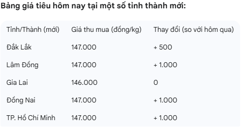 Cụ thể, tại khu vực Tây Nguyên, giá tiêu tại tỉnh Đắk Lắk (mới, sau sáp nhập với Phú Yên) được thu mua ở mức 147.000 đồng/kg, tăng 500 đồng. Tại tỉnh Lâm Đồng (mới, bao gồm cả Đắk Nông và Bình Thuận), nơi có diện tích trồng tiêu đáng kể từ tỉnh Đắk Nông cũ, giá cũng đạt mức cao 147.000 đồng/kg, tăng 1.000 đồng. Trong khi đó, tại tỉnh Gia Lai (mới, sáp nhập với Bình Định), giá tiêu giữ nguyên ở mức 146.000 đồng/kg.