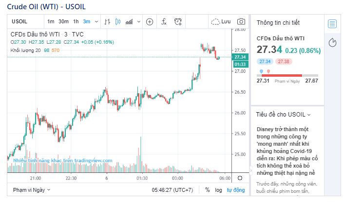 Cụ thể, Tại thời điểm 5h30 (giờ Việt Nam), giá dầu WTI tăng 0,77% lên 27,32 USD/thùng, giá dầu Brent tăng 14,38% lên 31,97 USD/thùng.