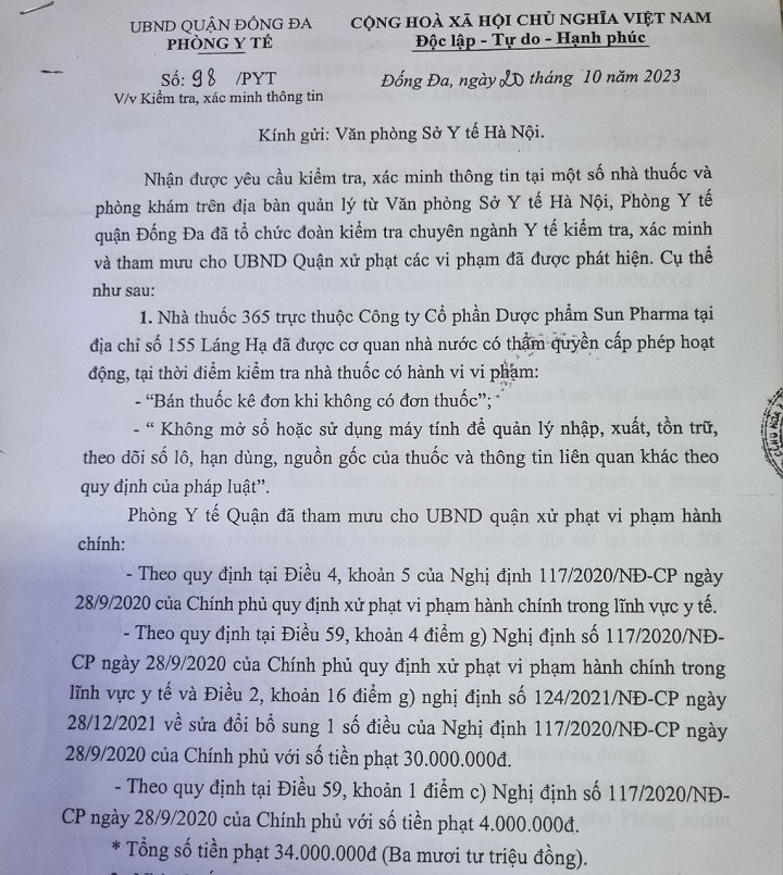Tại văn bản số 98/PYT của Quận Đống Đa, TP Hà Nội báo cáo Sở Y tế Hà Nội về việc Nhà thuốc 365 trực thuộc Công ty Cổ phần Dược phẩm Sun Pharma đã bán thuốc kê đơn nhưng không có đơn thuốc, tổng mức xử phạt 34 triệu đồng.