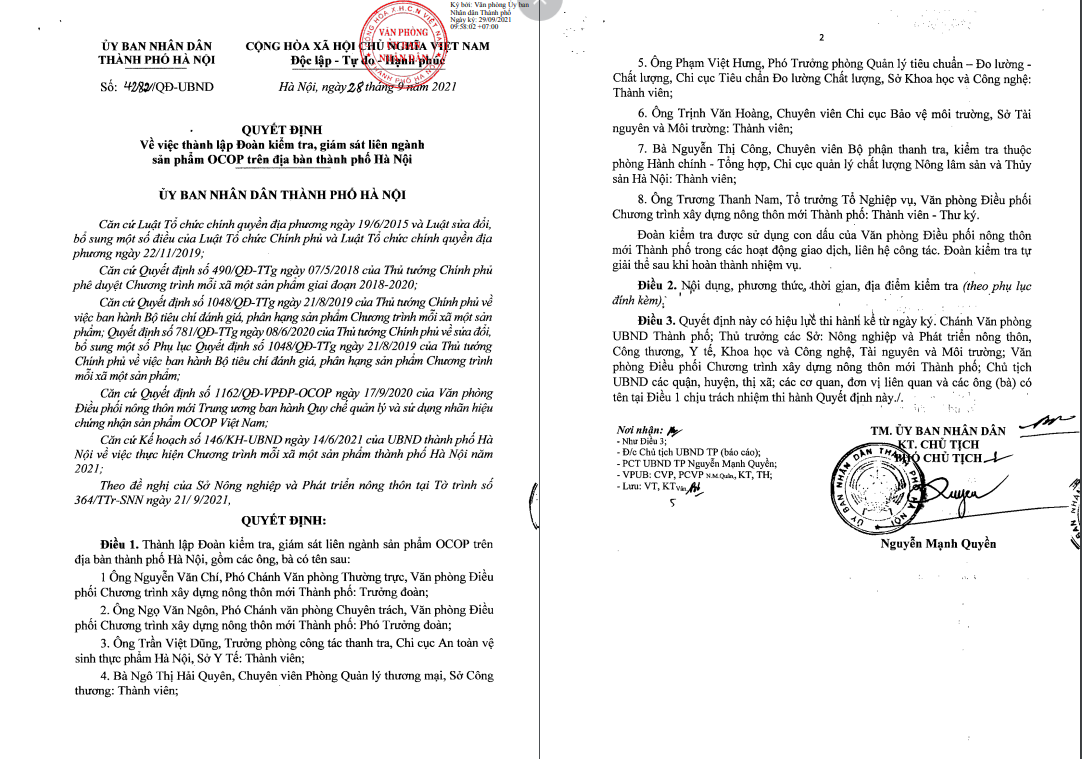 Mới đây, UBND Thành phố Hà Nội đã ban hành Quyết định số 4248/QĐ-UBND về việc Thành lập đoàn kiểm tra, giám sát liên ngành đối với sản phẩm OCOP trên địa bàn thành phố. Kế hoạch kiểm tra được thực hiện trong Quý IV/2021 bên cạnh việc tuân thủ các quy tắc phòng chống dịch bệnh Covid-19.