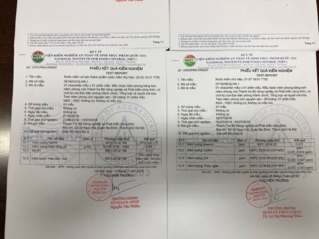 Mẫu kết quả kiểm nghiệm nước mắm có chưa chất tẩy rửa bồn cầu. Ảnh: VietQ