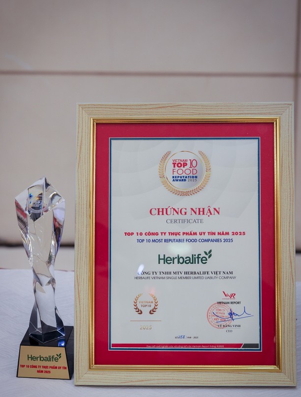 Đầu năm nay, Herbalife Việt Nam cũng vinh dự được Hội Sở Hữu Trí Tuệ Việt Nam công nhận là thương hiệu danh tiếng tại Việt Nam năm 2025 với Chứng nhận Top 10 Nhãn Hiệu Nổi Tiếng Việt Nam. Chương trình đánh giá, ghi nhận, và quảng bá các doanh nghiệp có bề dày thành tích phát triển, chất lượng vượt trội, tính cạnh tranh cao, thân thiện với môi trường và được người tiêu dùng tín nhiệm.