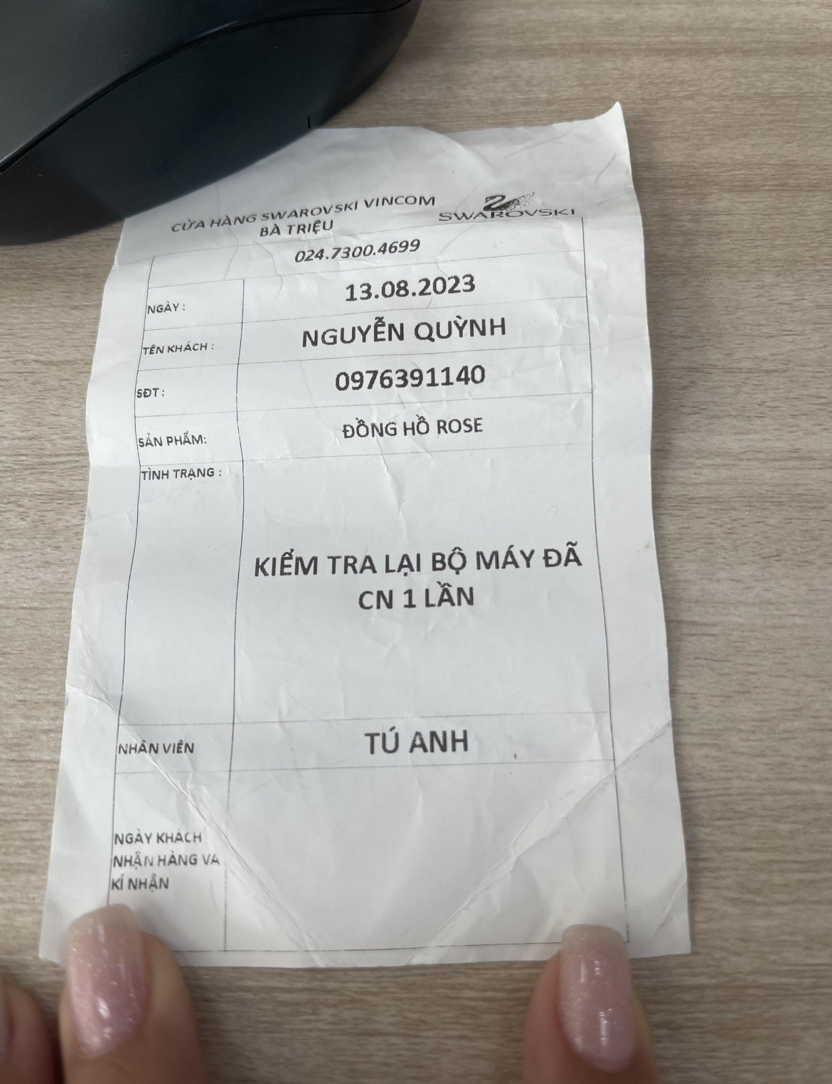Ngày 24/6/2023, chị Quỳnh lựa chọn đổi chiếc đồng hồ Swarovski mới cùng mẫu mình đã mua trước đó. Nhưng sử dụng đến ngày 12/8/2023, chiếc đồng hồ mới đổi của chị lại tiếp tục “không chạy”. Một lần nữa, chị Quỳnh đem đồng hồ này đến cửa hàng bảo hành và để nhân viên giữ lại kiểm tra với thông tin “hôm sau gọi lại”. Nhưng vẫn như những lần trước đó, chị Quỳnh phải chủ động gọi thì nhân viên của Công ty ACFC mới thông báo tình trạng lỗi sản phẩm.