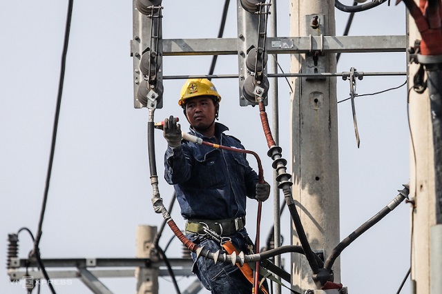 Công nhân Điện lực TP HCM sửa chữa trên đường dây. Ảnh: Thành Nguyễn